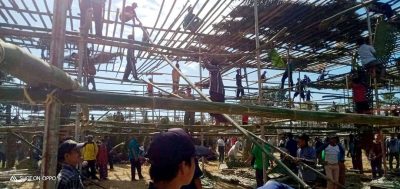 Pada Ahad (07/08) ribuan jamaah tumpah di Anjani untuk membuat tetaring (terop tradisional yang dibuat dari anyaman daun kelapa red.) sesuai pembagian dari panitia.