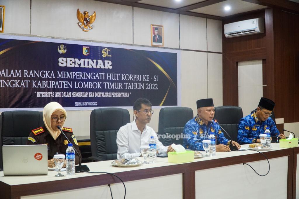 Lombok Timur SR – Bupati Kabupaten Lombok Timur H. M. Sukiman Azmy membuka seminar dalam rangka peringatan HUT Korpri ke – 51. Seminar bertema integritas ASN dalam menghadapi era digitalisasi kepemerintahan, itu berlangsung Selasa (25/10). Kegiatan yang berlangsung di Rupatama 1 Kantor Bupati itu dihadiri oleh Sekretaris Daerah, PPK, pimpinan OPD, kabag dan camat lingkup kabupaten Lombok Timur.