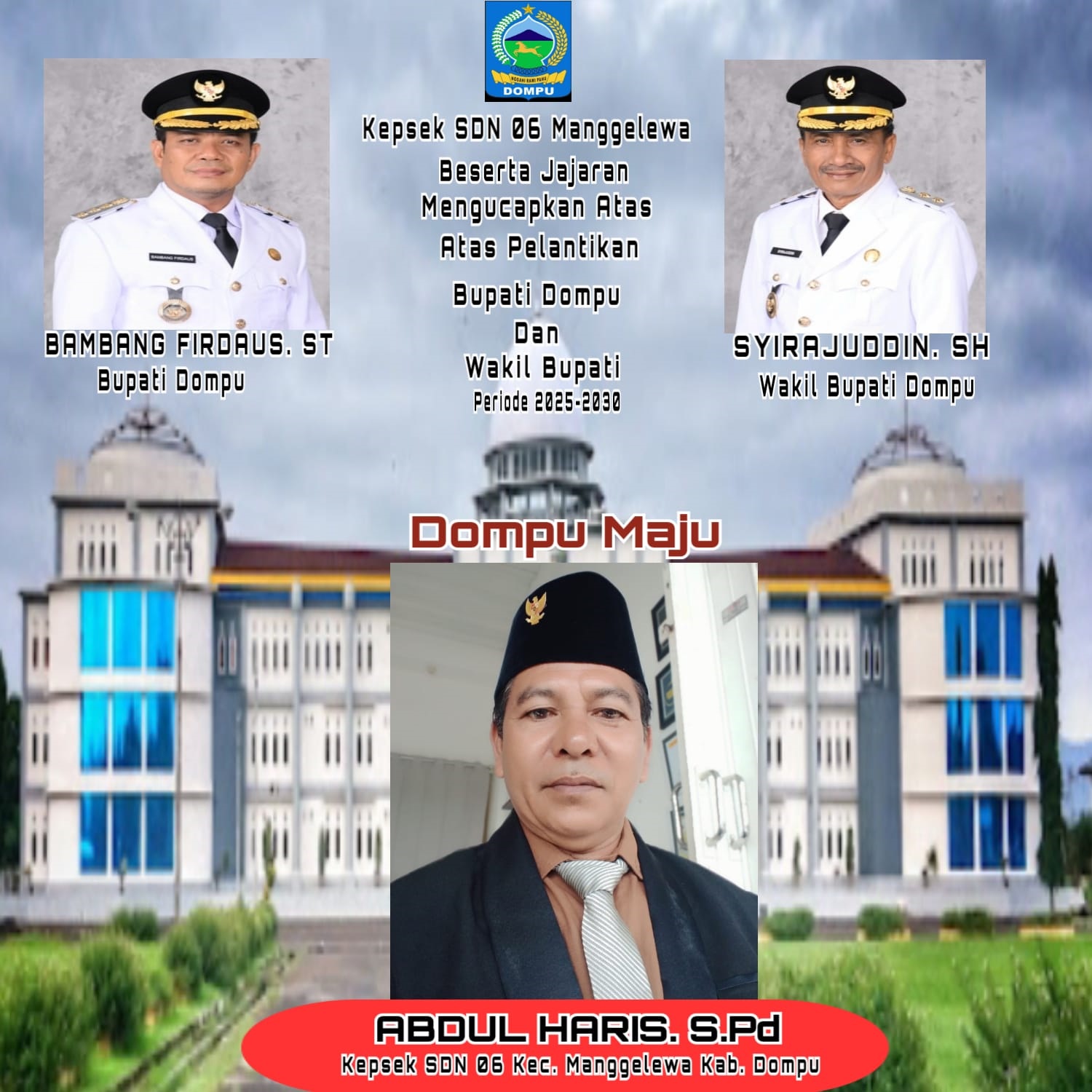 KEPALA SDN 06 MANGGALEWA DOMPU MENGUCAPKAN SELAMAT ATAS DILANTIK BAMBANG FIRDAUS DAN SYIRAJUDDIN SEBAGAI BUPATI DAN WAKIL BUPATI KAB. DOMPU PERIODE 2025-2030