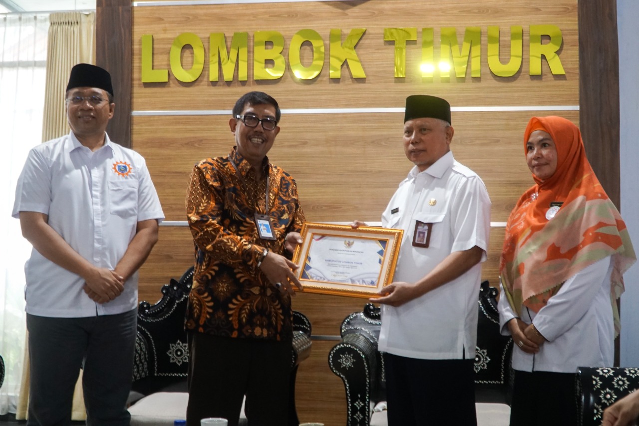 Lombok Timur SR – Kepala Kantor Wilayah Ditjen Perbendaharaan (DPJB) Provinsi Nusa Tenggara Barat, Sudarmanto menyerahkan plakat dan piagam kepada Kabupaten Lombok Timur atas keberhasilannya menyusun dan menyajikan laporan keuangan tahun 2021 dengan opini WTP. Plakat dan piagam itu diterima langsung oleh Bupati Kabupaten Lombok Timur H. M. Sukiman Azmy, Rabu (12/10) di Pendopo Bupati. Opini WTP tersebut merupakan yang ke-enam kalinya.