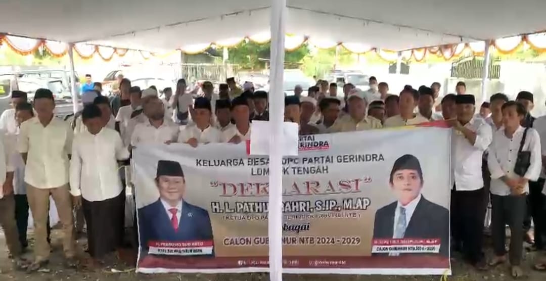 “Kamo segenap pengurus DPC Partai Gerindra Kabupaten Lombok Tengah menyatakaan mendukung penuh bapak H.L.Pathul Bahri S.IP, M.AP menjadi bakal Calon Gubernur Provinsi NTB tahun 2024-2029,” kata M.Tauhid memimpin pembacaan deklarasi.