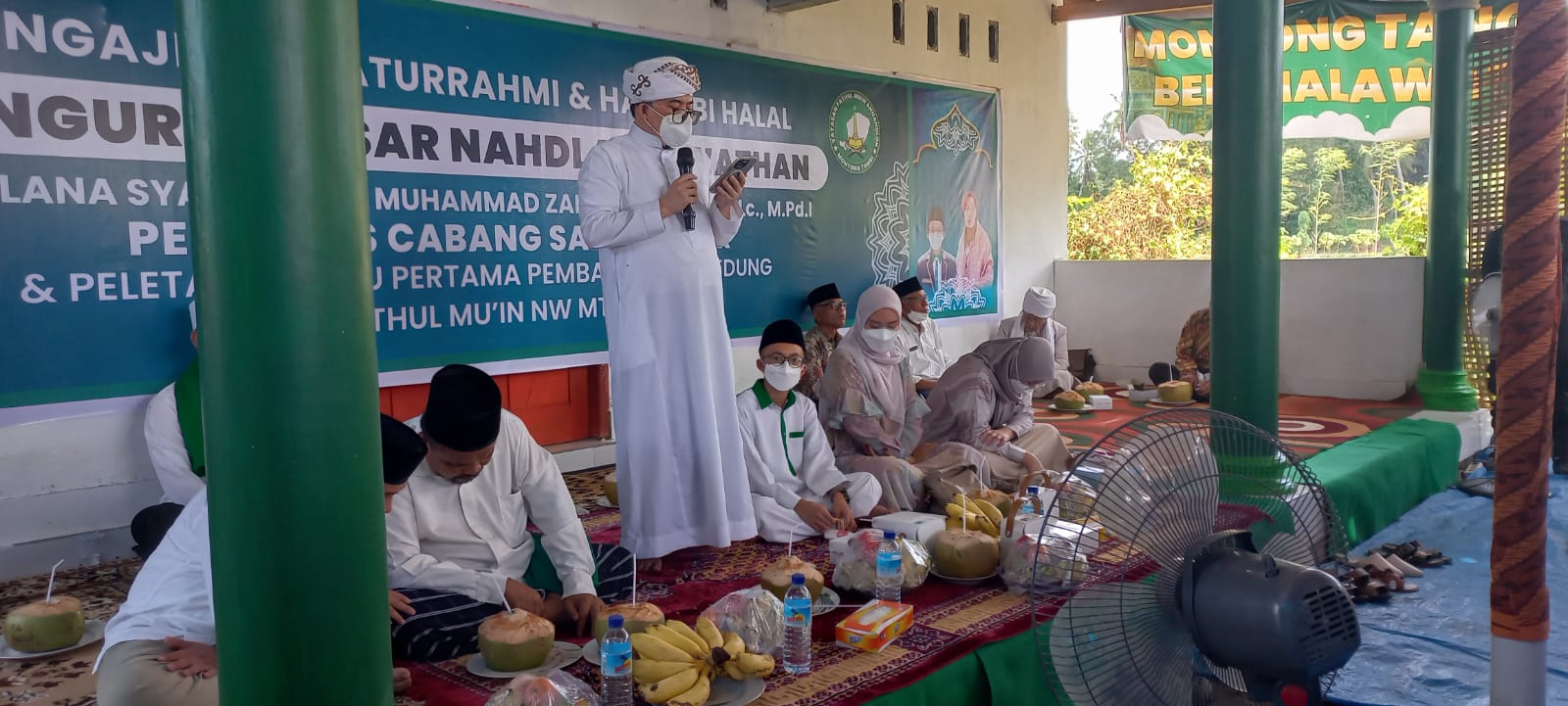 Lombok Timur SR – Ketua Umum Pengurus Besar Nahdlatul Wathan (PBNW) TGKH Lalu Gde Muhammad Zainuddin Atsani, menghadiri peletakan peletakan batu pertama pembangunan gedung Madrasah Tsanawiyah (MTS.) Fathul Muin NW Montong Tangi, Kecamatan Sakra Timur, pada Selasa (31/5/2022) Acara tgersebut dirangkai dengan pengajian Silaturrahim PBNW dan Halal bi Halal juga pelantikan Pimpinan Anak Cabang Pemuda NW Desa Montong Tangi.