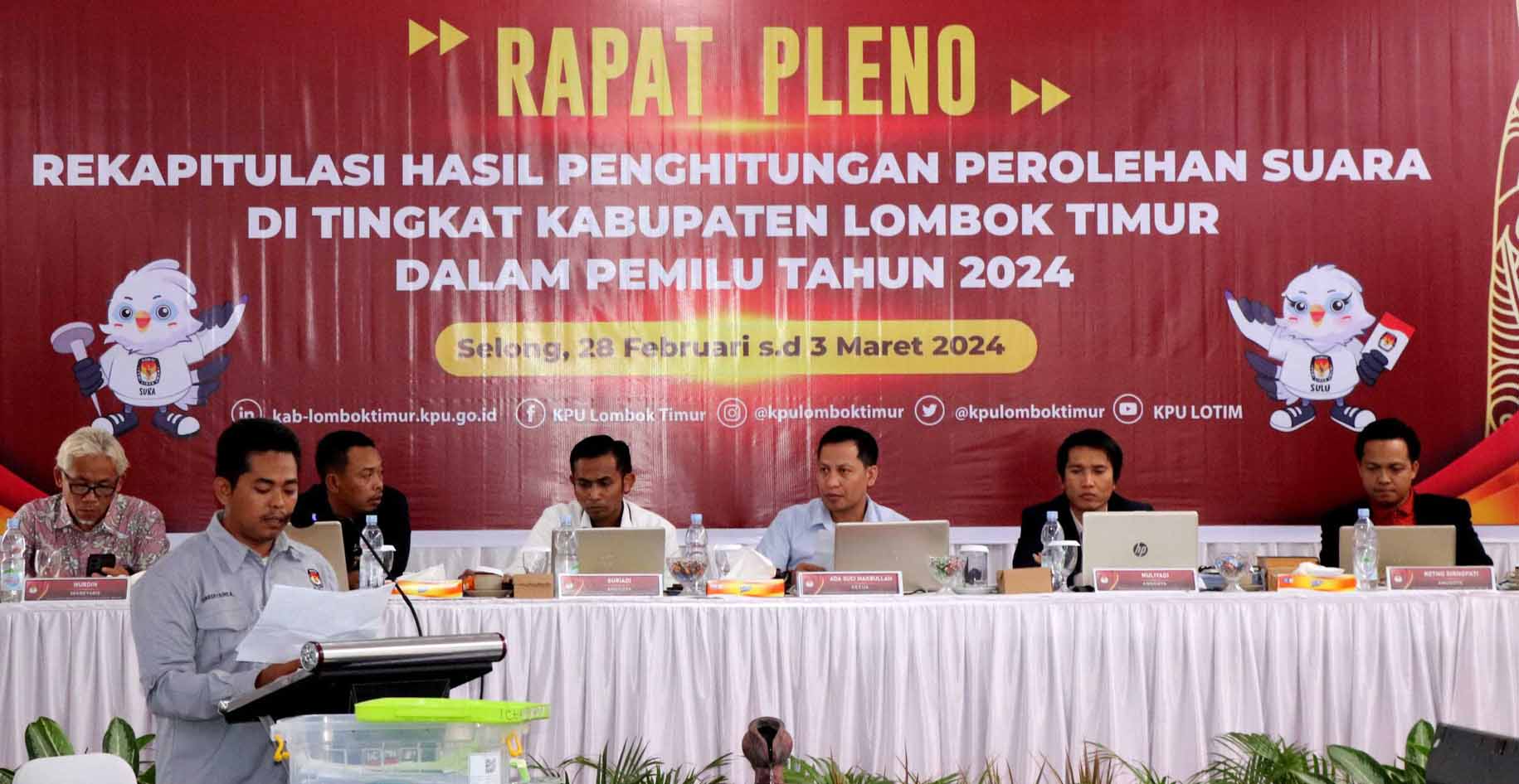 Lombok Timur suararinjani.com – Komisi Pemilihan Umum (KPU) Lombok Timur (Lotim) telah menyelesaikan rapat pleno rekapitulasi prolehan suara Pemilihan Umum (Pemilu) 2024 calon anggota legislatif (Caleg) tingkat kabupaten/kota, provinsi, DPR RI, DPD dan pemilihan presiden (Pilpres). Pleno diselenggarakan di halaman kantor KPU setempat sejak tanggal 28 Februari-03 Maret 2024.