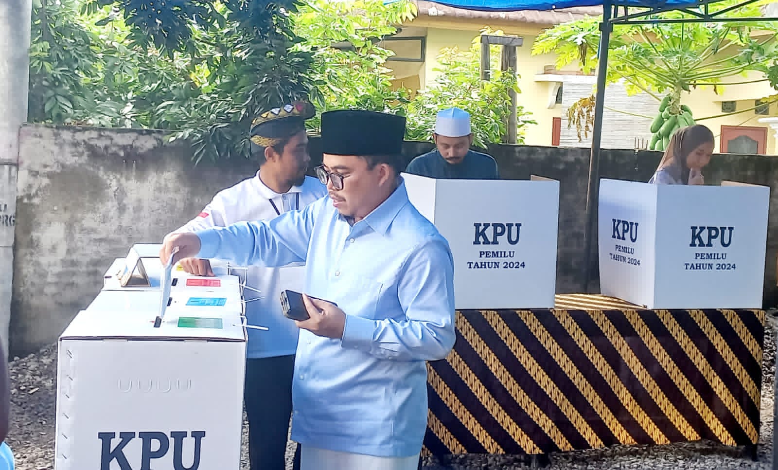 Penasihat TKN Prabowo-Gibran, Maulana Atsani yang didampingi istri Hj Oryza Sativa terlihat menggunakan baju khas pasangan Prabowo-Gibran. Selain itu terlihat juga bersamanya Ketua PW NW Provinsi NTB TGH L G Muhammad Khairul Fatihin bersama istri ikut menyalurkan hak suaranya di TPS tersebut.